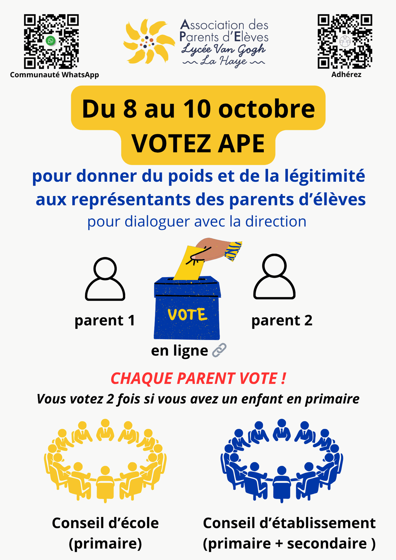 Cette semaine, les 8, 9 et 10 octobre auront lieu les élections des représentants de parents d’élèves au Conseil d’école et au Conseil d’établissement du Lycée français Vincent Van Gogh.